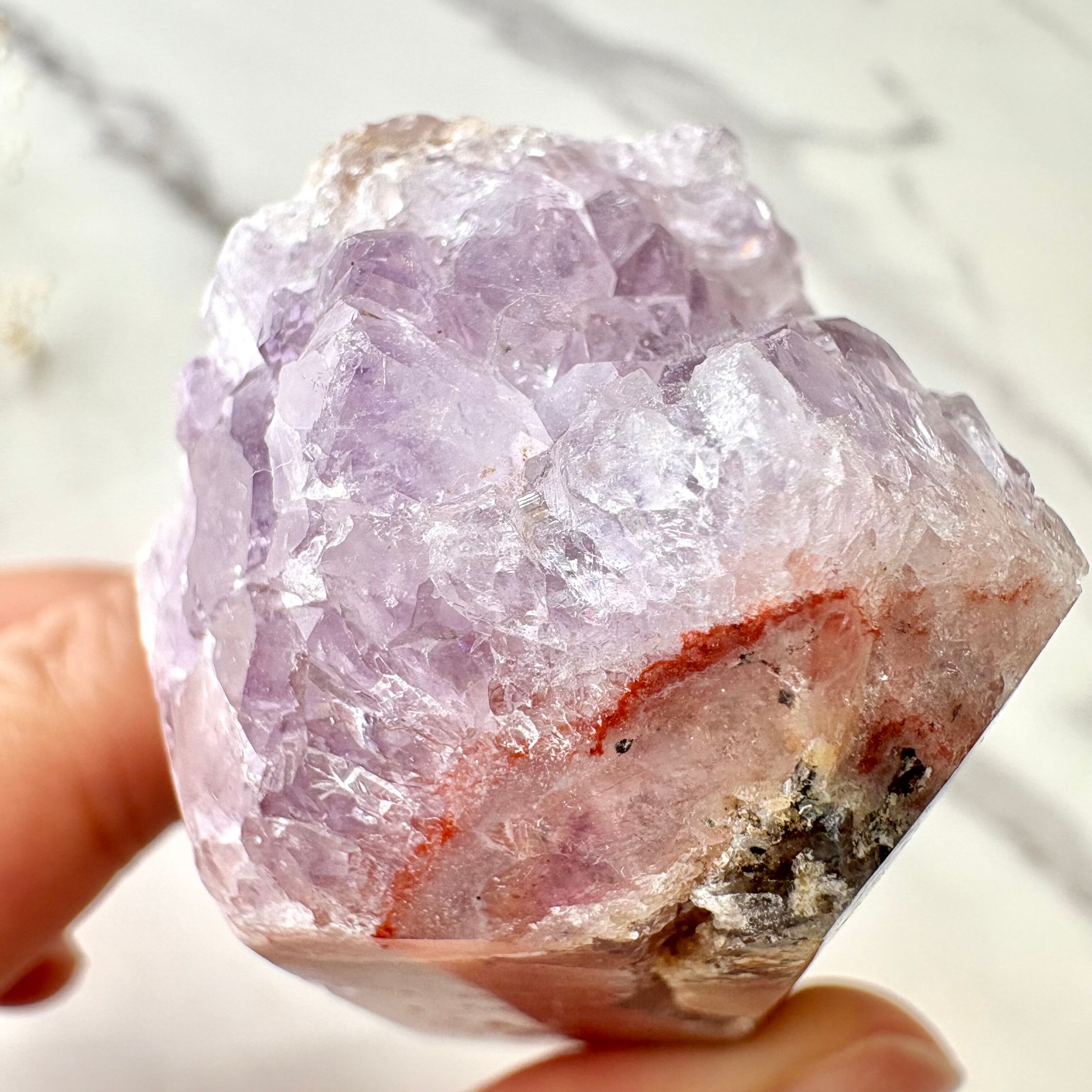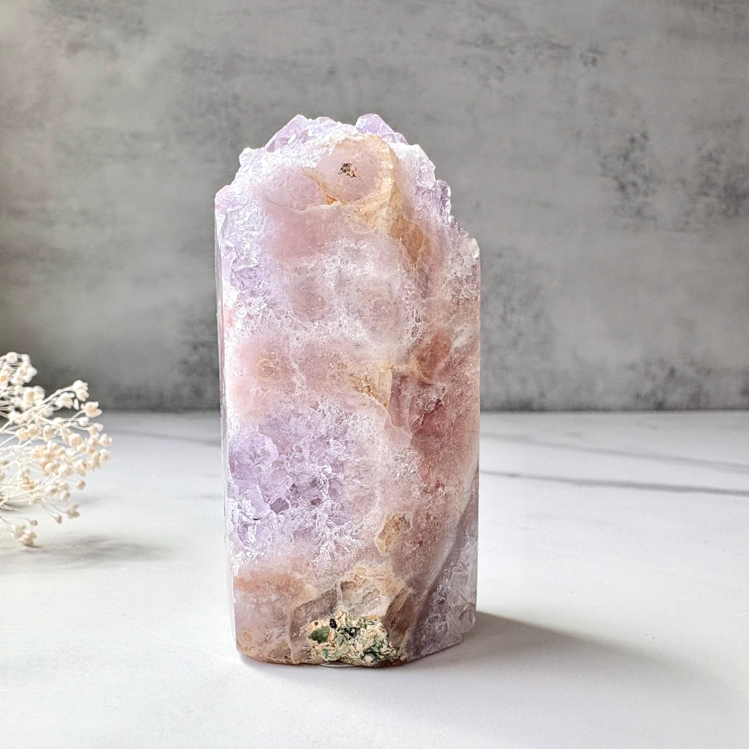 ラベンダー色のアメジストの結晶が織りなす輝きが美しいタワーです。ピンクアメジストの鮮やかなピンクのラインがさらに彩りを与えており、透き通る光を受けると、まるで朝靄に包まれたお花畑のように、静かで優しい雰囲気を纏います。