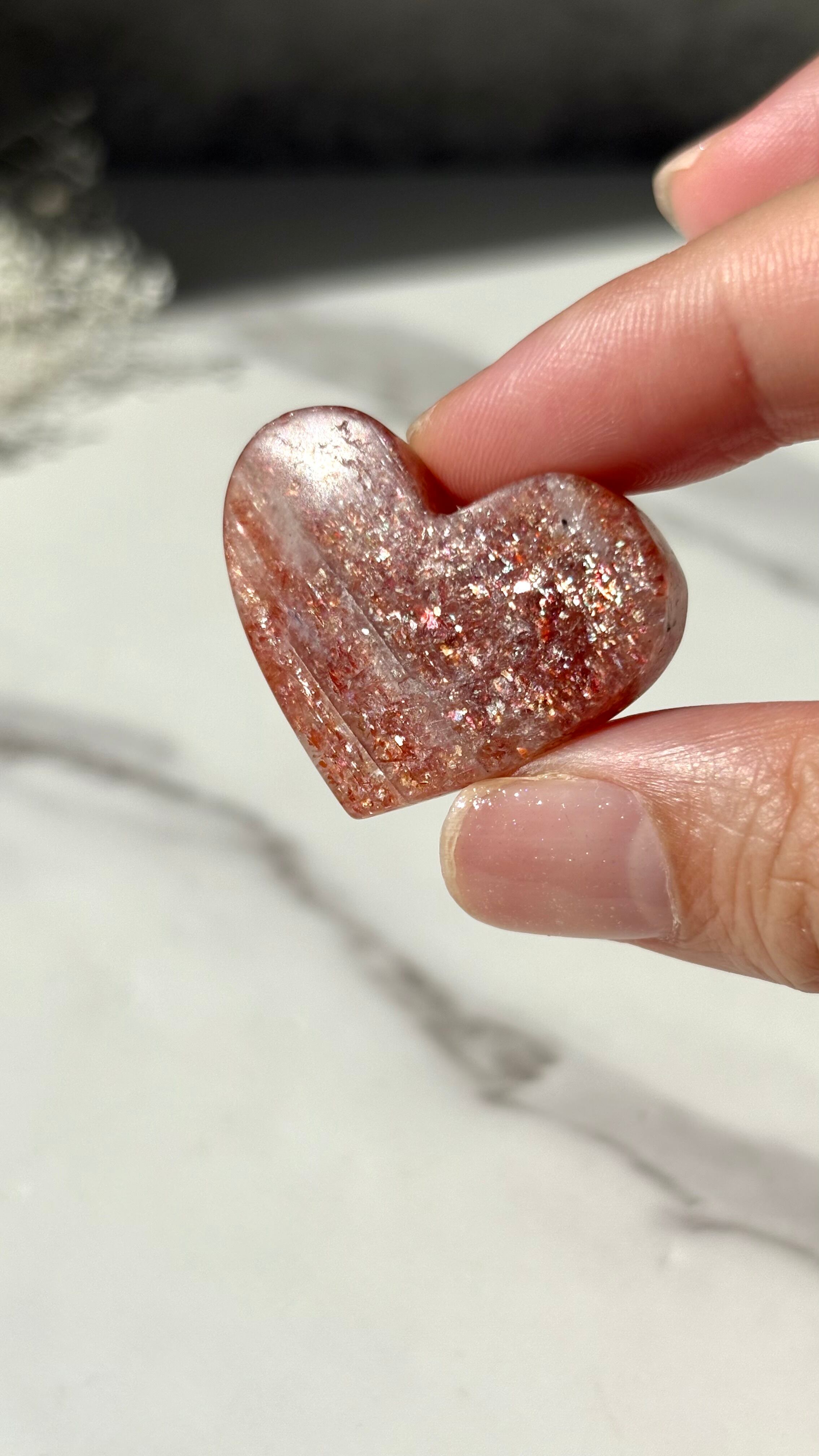 朝陽をそのまま閉じ込めたような、きらめき溢れるサンストーンのハート。