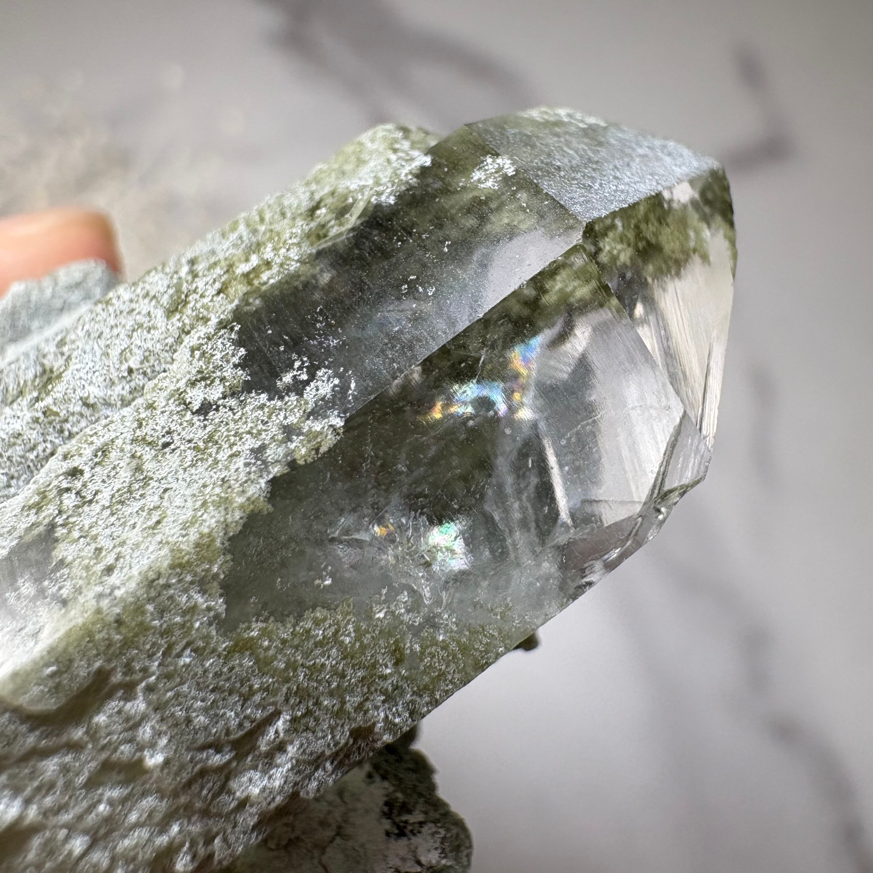 こちらの水晶クラスターは、クローライトをまとい、内側には澄んだ光を宿しています。