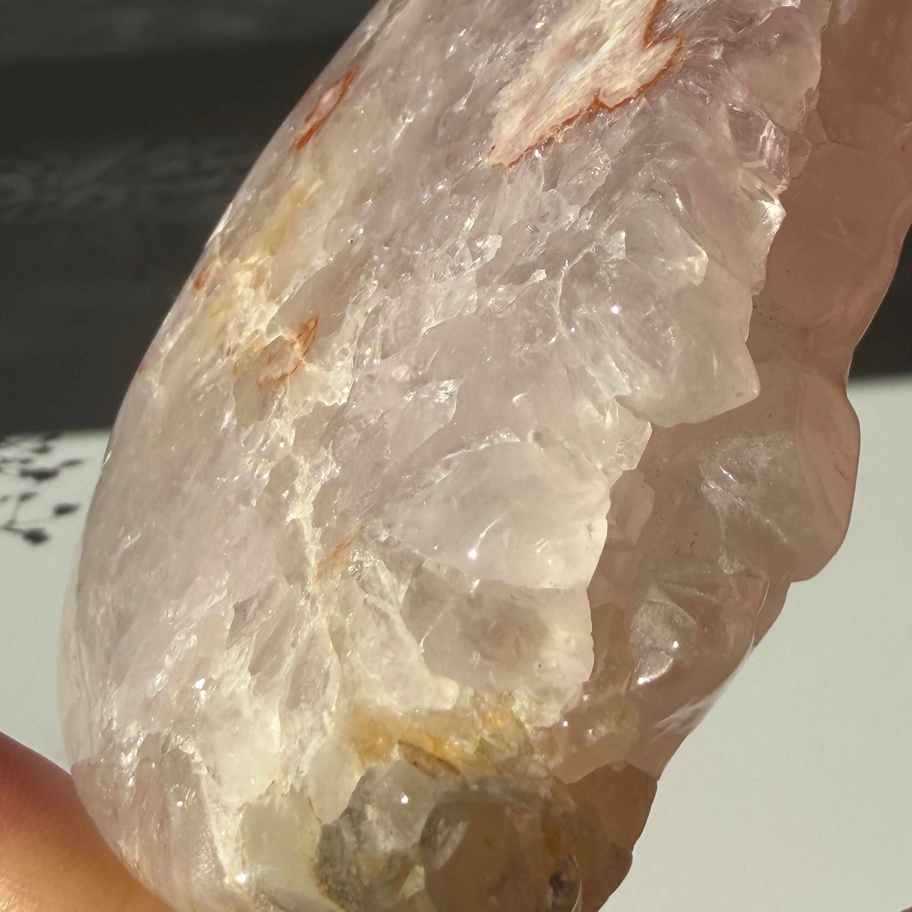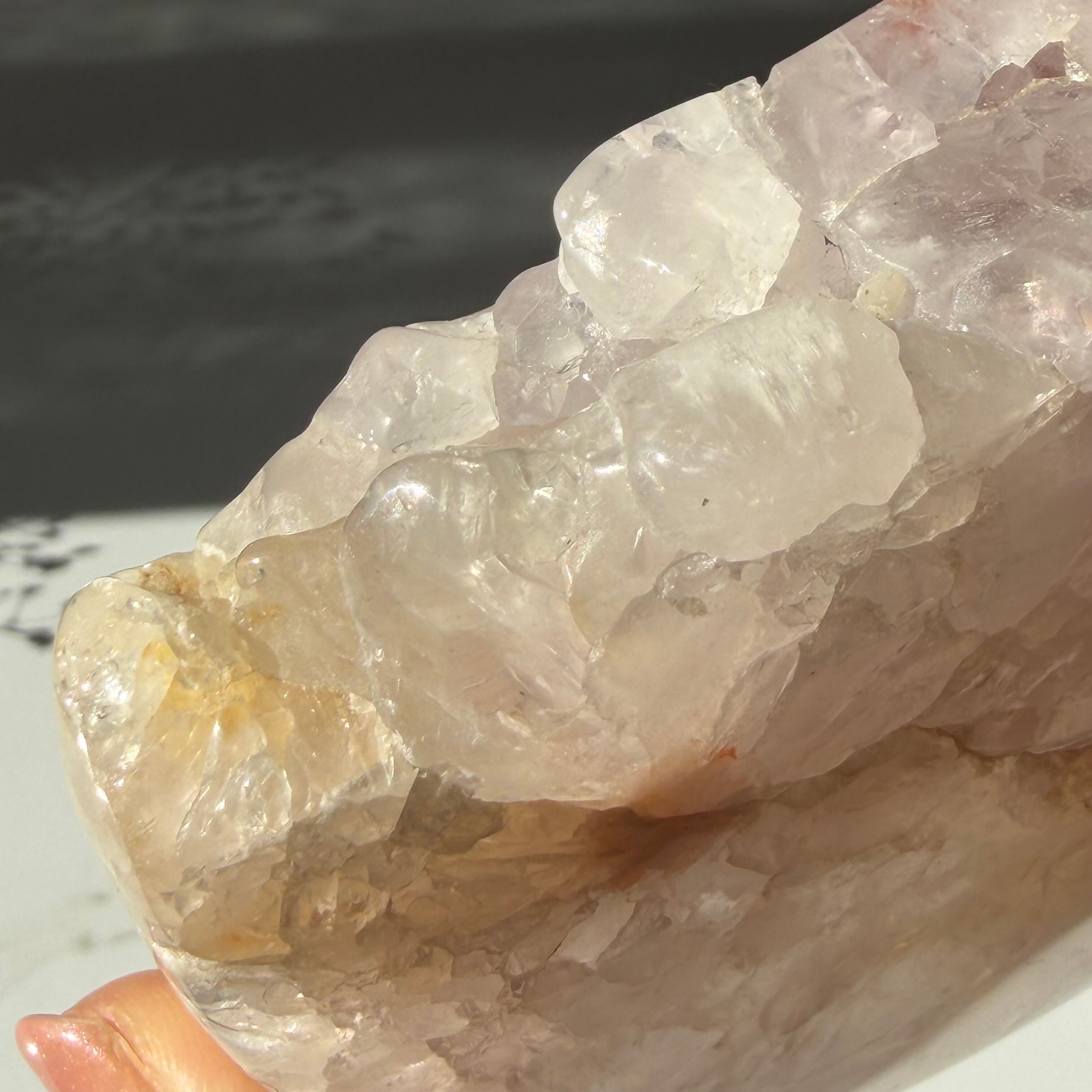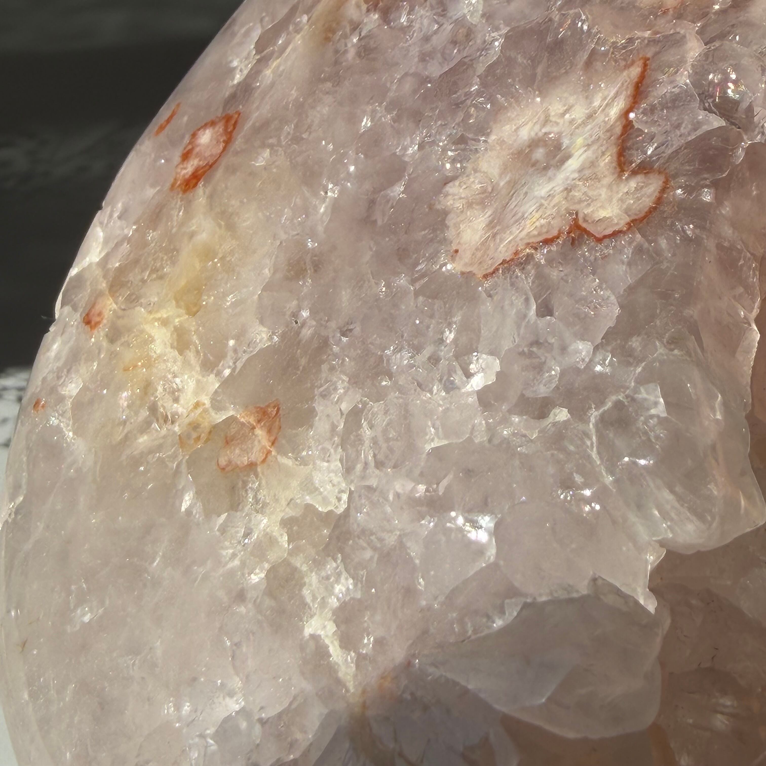 アメジストの透明感がある結晶面には、小さなレインボーも宿り、光が当たるときらめきます。