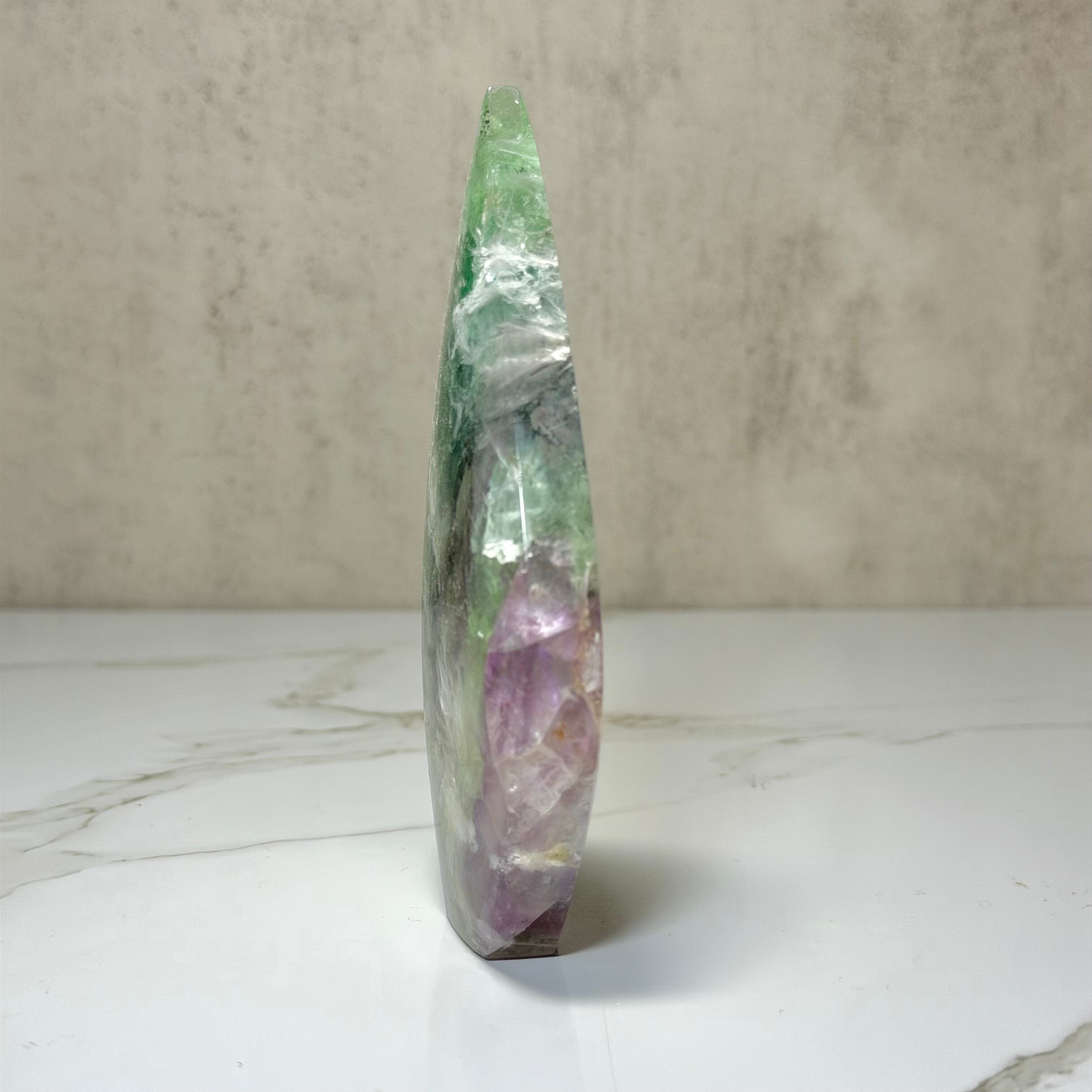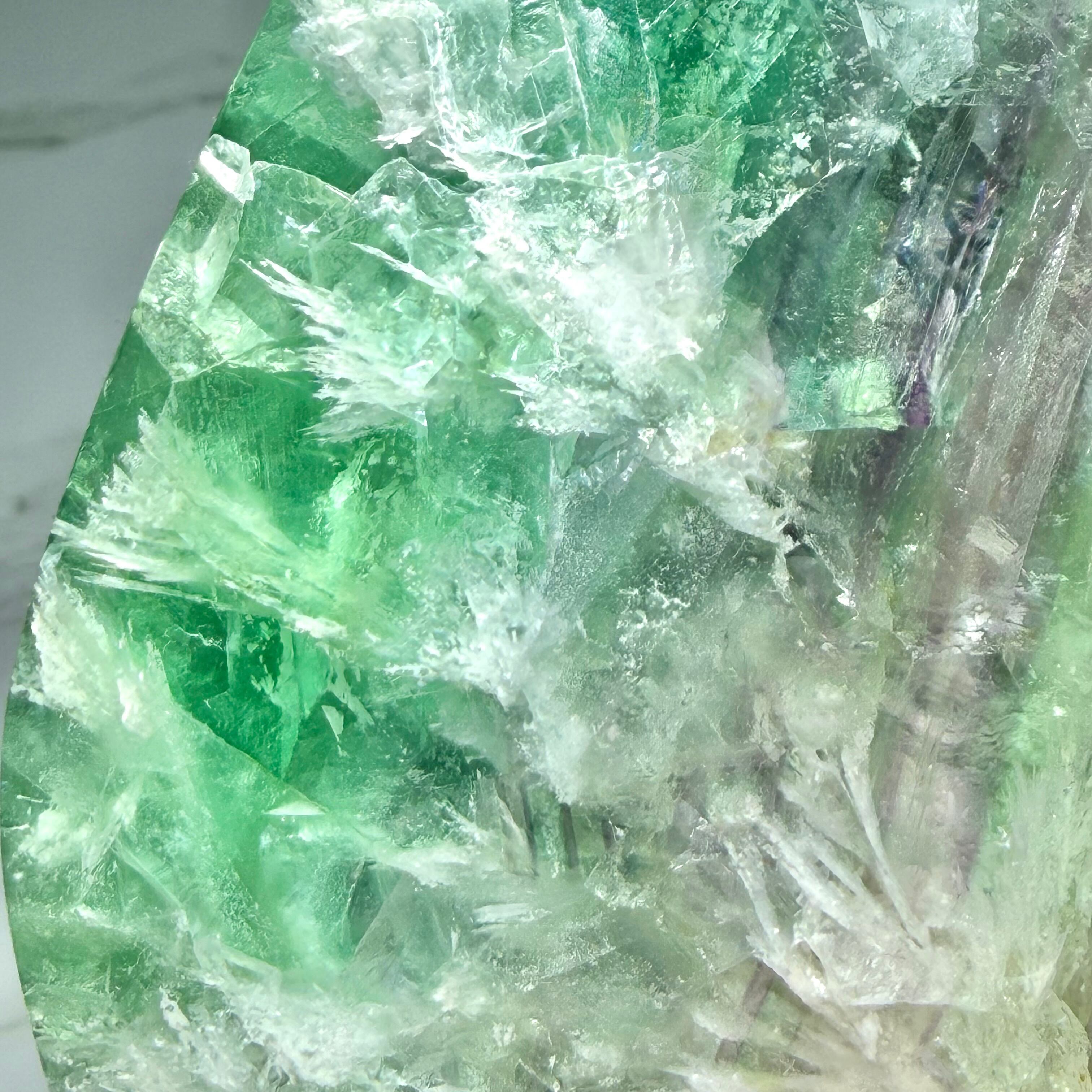 フローライトは、強い光を当てないと暗く見えてしまう個体も多い中、この子は天井の明かりのみでも、その鮮やかで美しい発色をしっかりと保ってくれます。 さらに、特筆すべきは至る所に現れる「虹(アイリス)」の輝き。