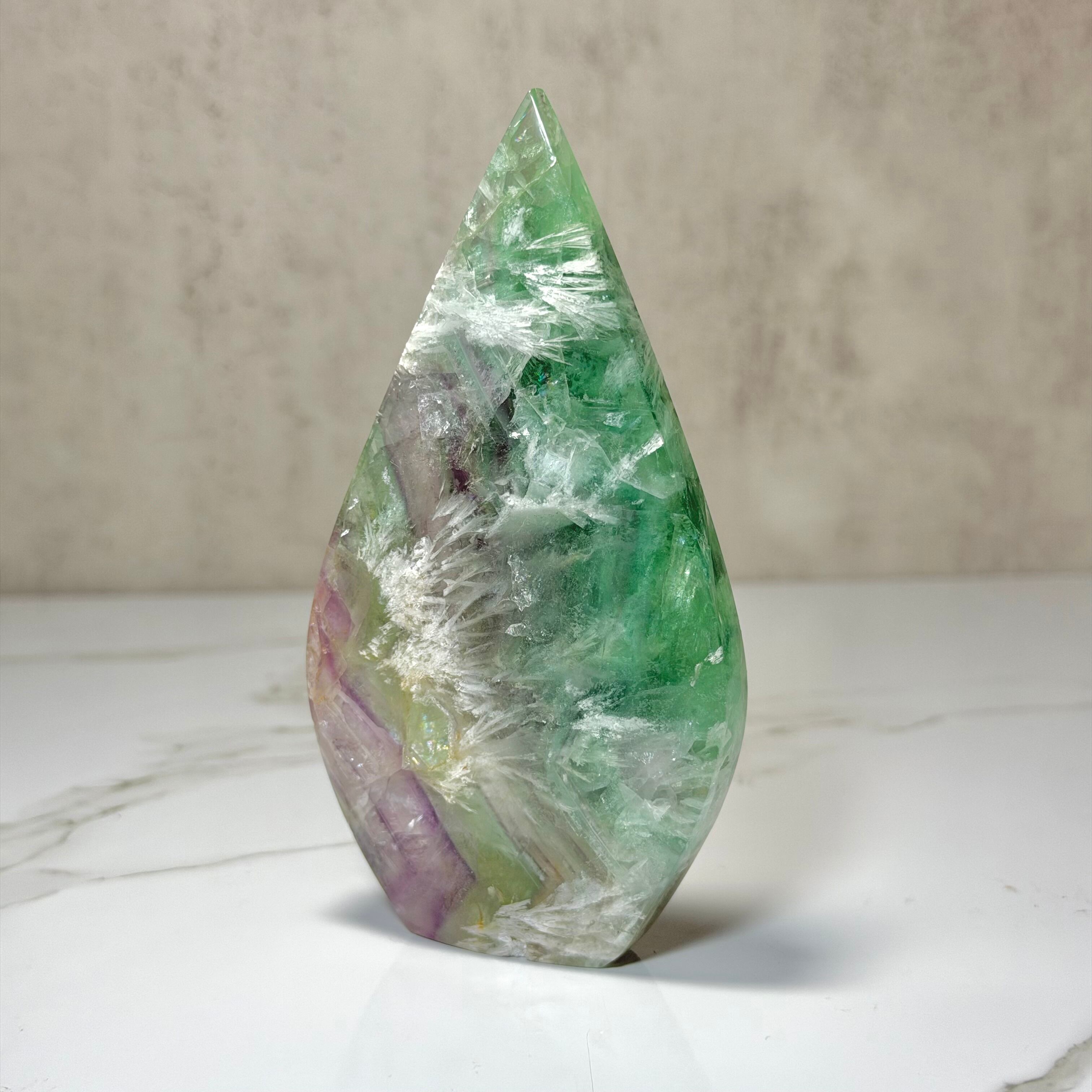 ふんわりと舞い降りた天使の羽(エンジェルフェザー)がぎっしりと閉じ込められた、フローライトのフレイム(炎型)です。
