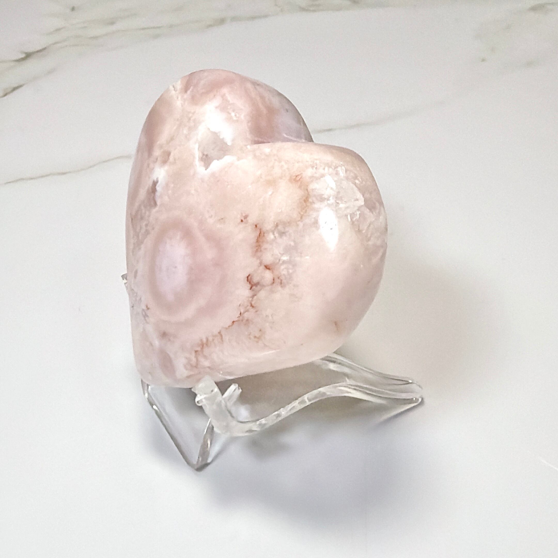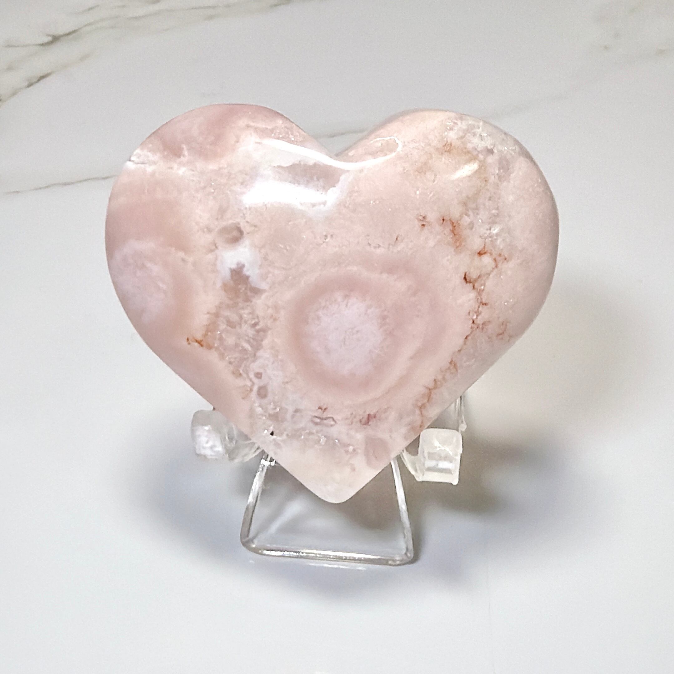 ふんわりとしたピンクベージュの色彩の中に、白いお花が咲いたような模様が広がるフラワーアゲートのハートです。