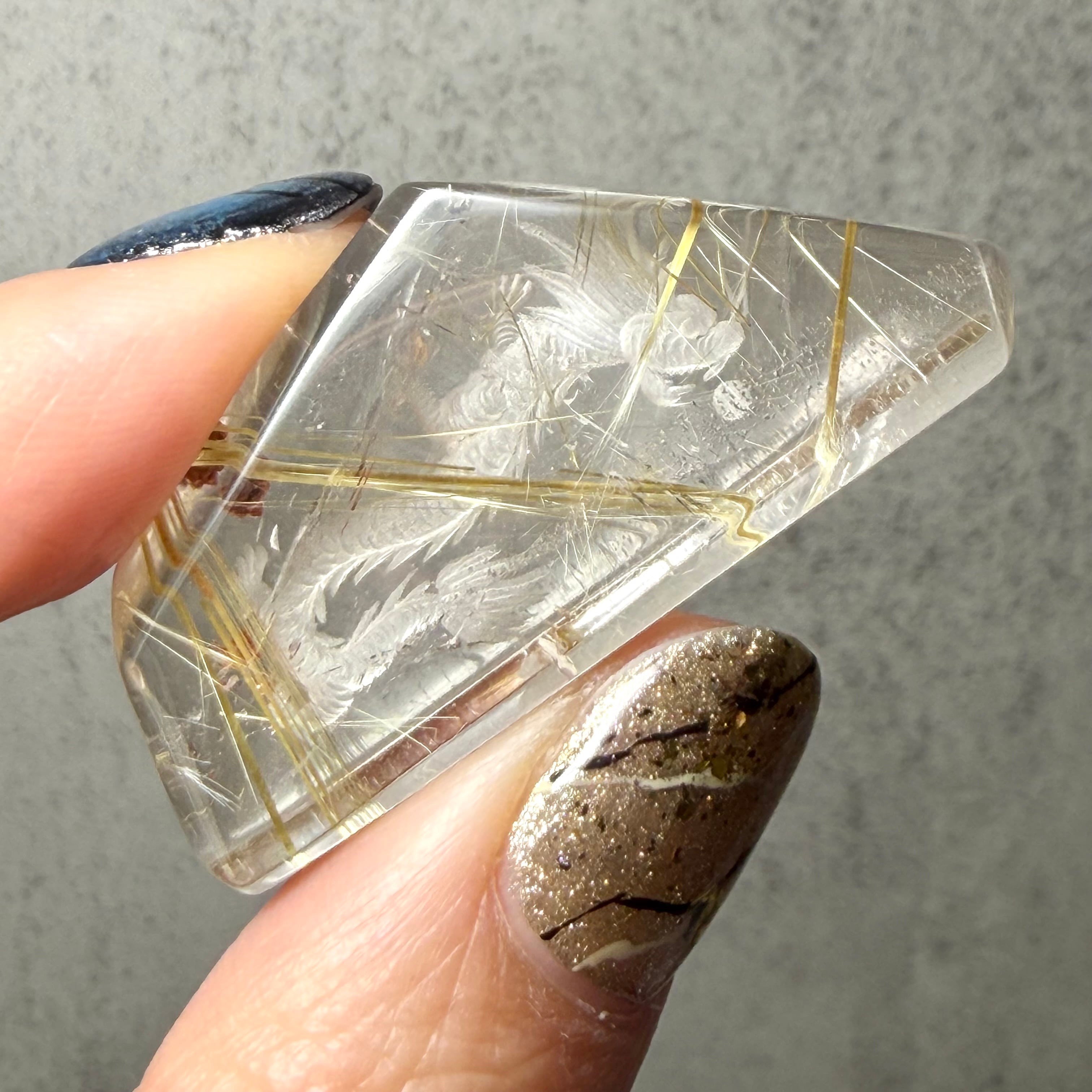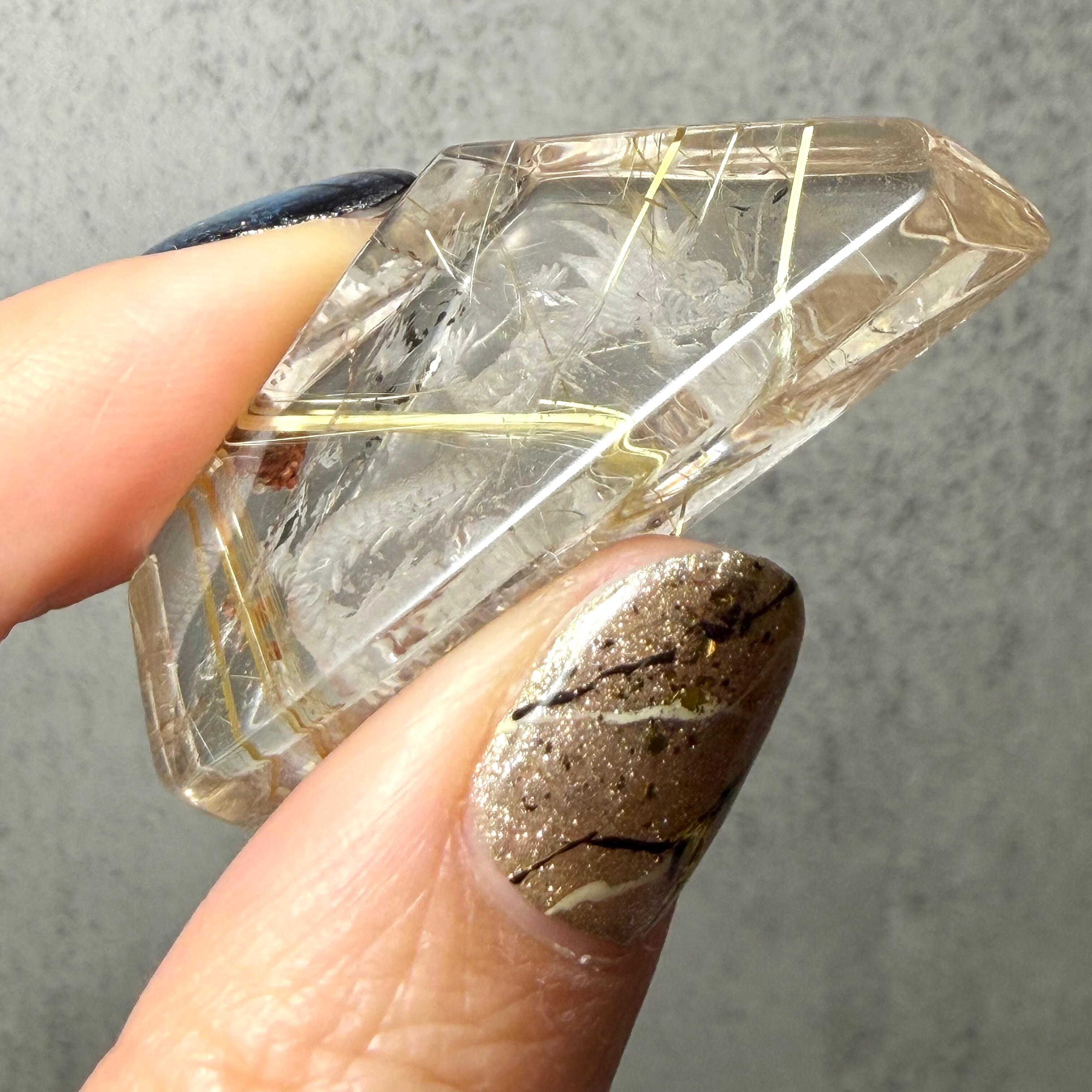 石の裏側から彫り込みを入れる「インタリオ」という技法により、クォーツの内部に龍が立体的に宿っているように見えます。光が透過すると、彫刻の細部とルチルの輝きが重なり合い、まるで龍が黄金の雲の中を泳いでいるかのような幻想的な光景が広がります。