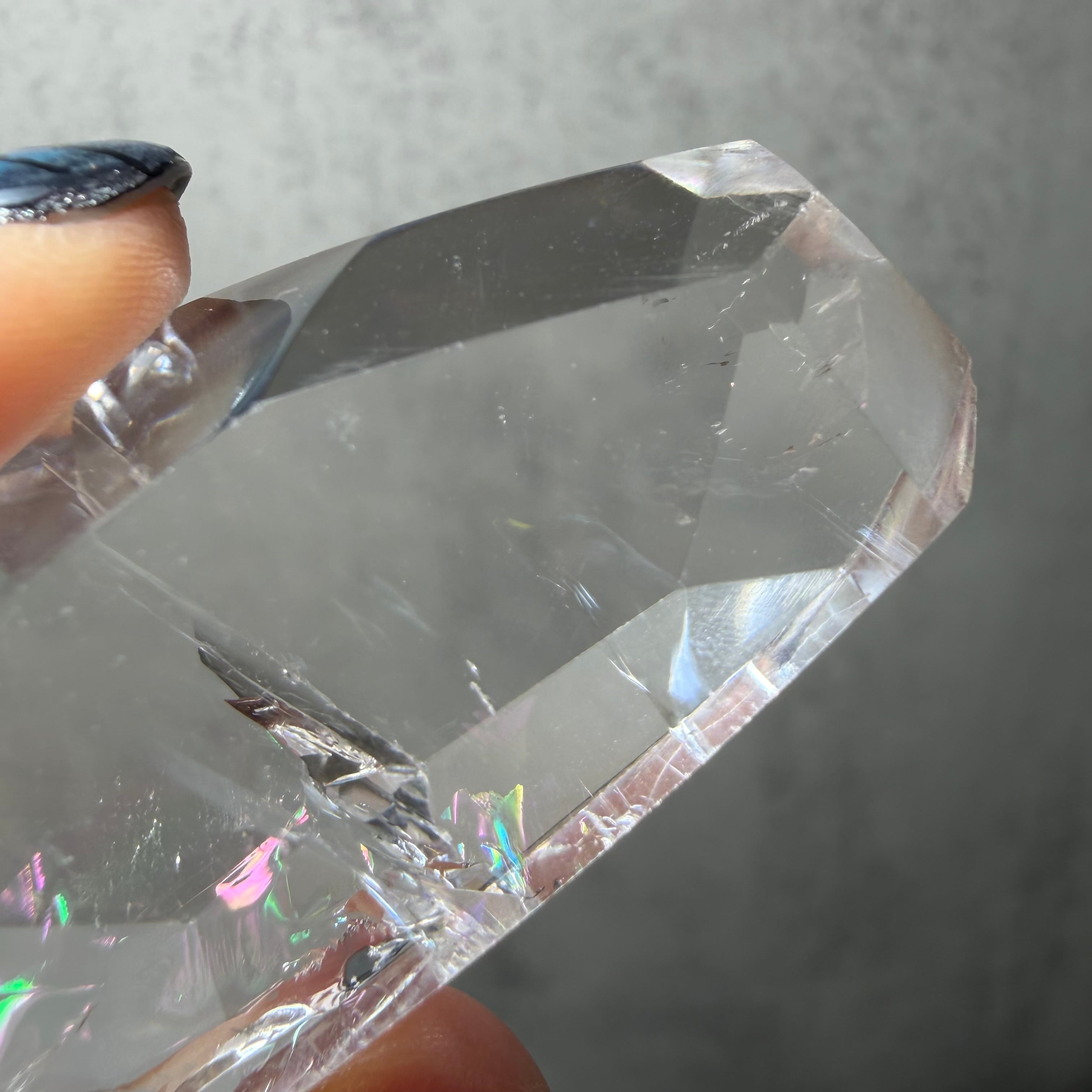 石の内部のクラックに光が反射し、鮮やかな七色の虹が美しく輝きます。