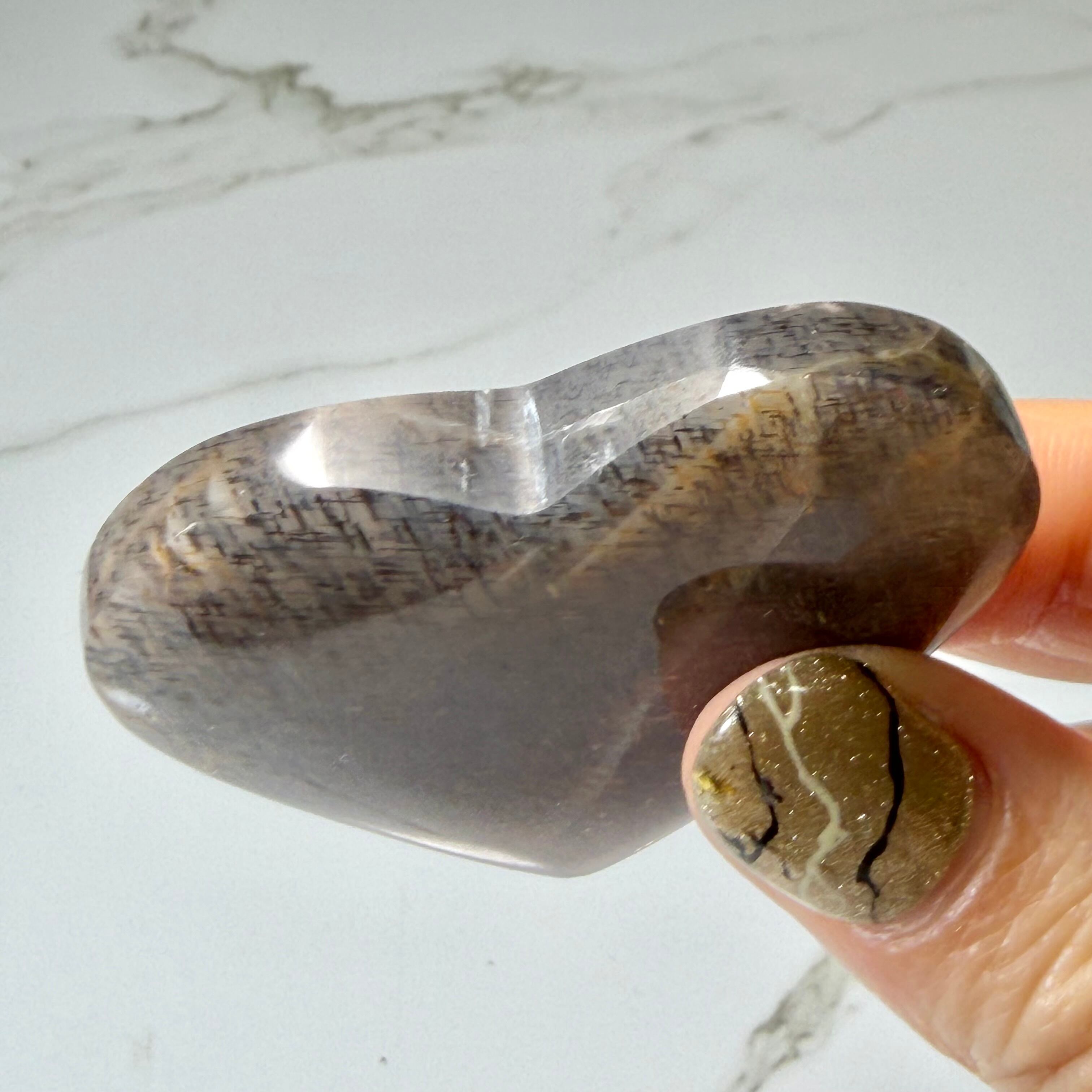 可愛らしいハートのフォルムと、キリリとした模様のギャップ。手のひらに収まるサイズ感(4.9cm)は、お守りとして握るのにも、光の当たる場所に飾って模様の不思議を眺めるのにも最適です。世界中の石愛好家が探し求める、希少な輝きをぜひお手元でお楽しみください。