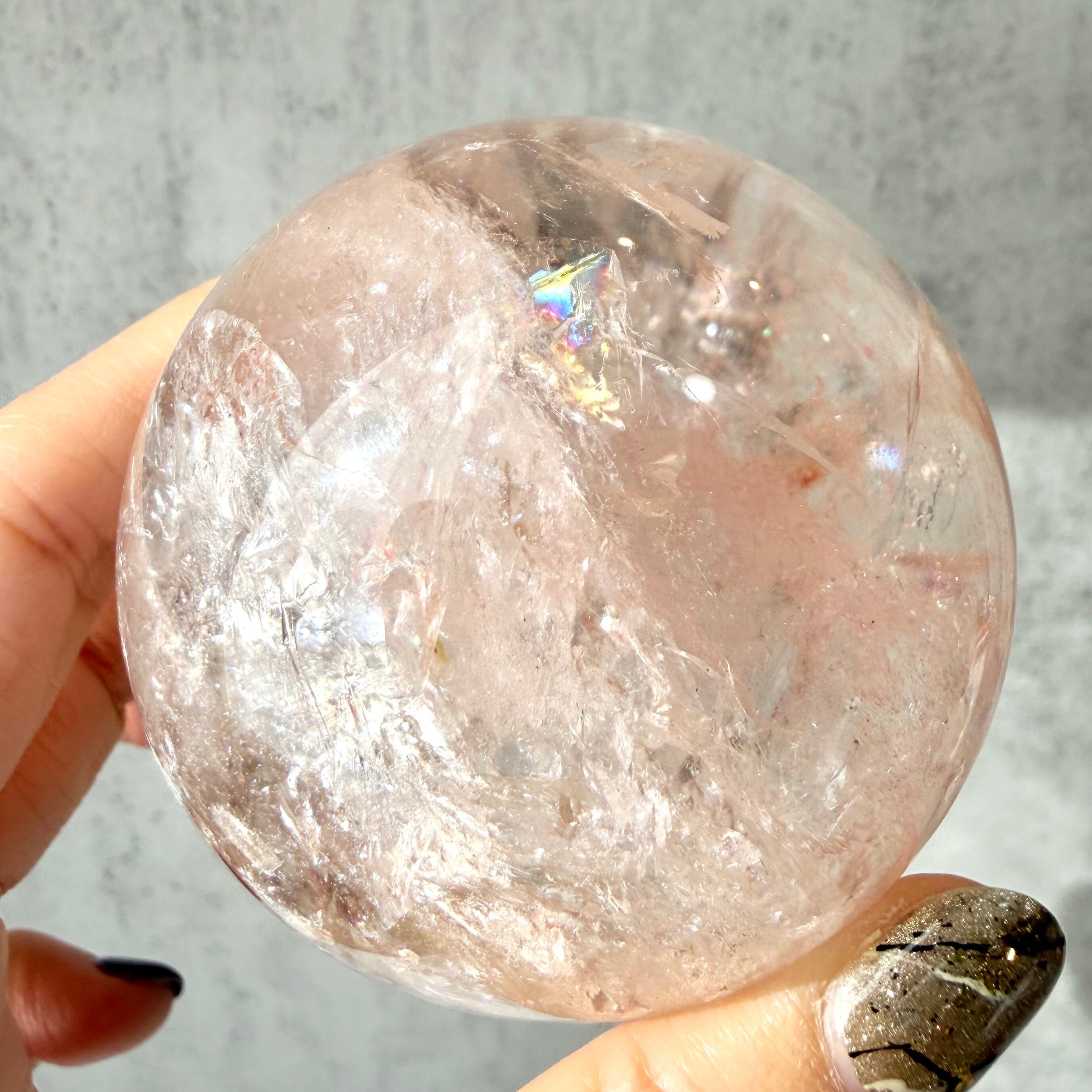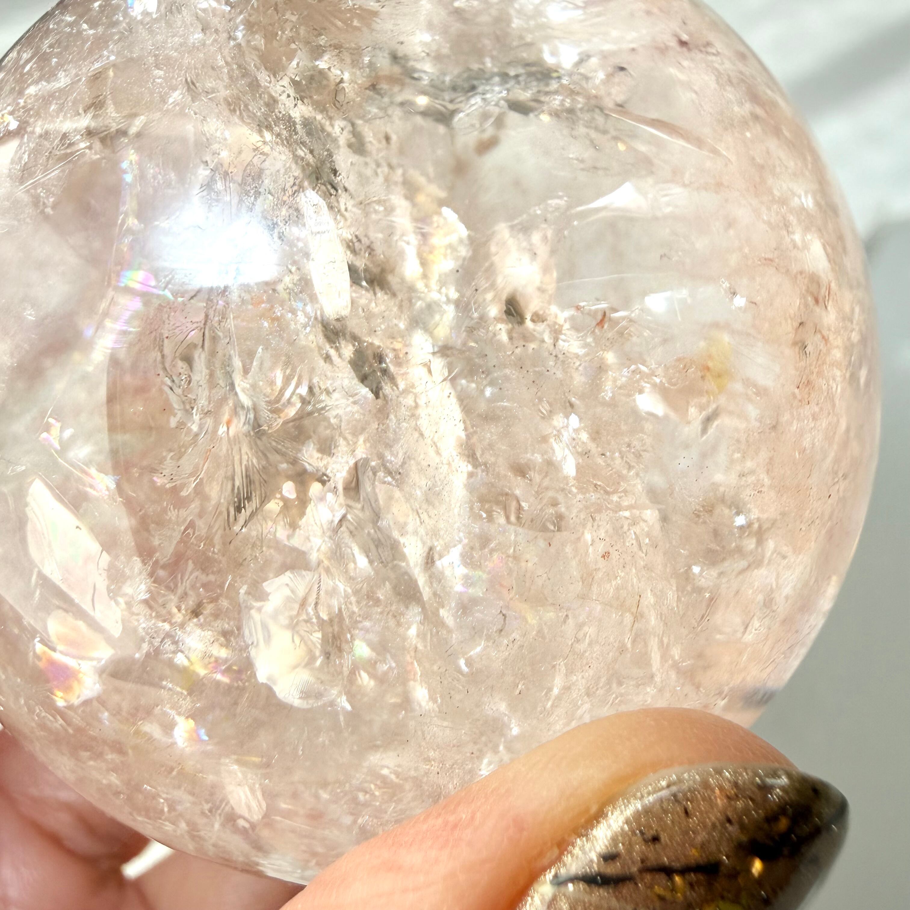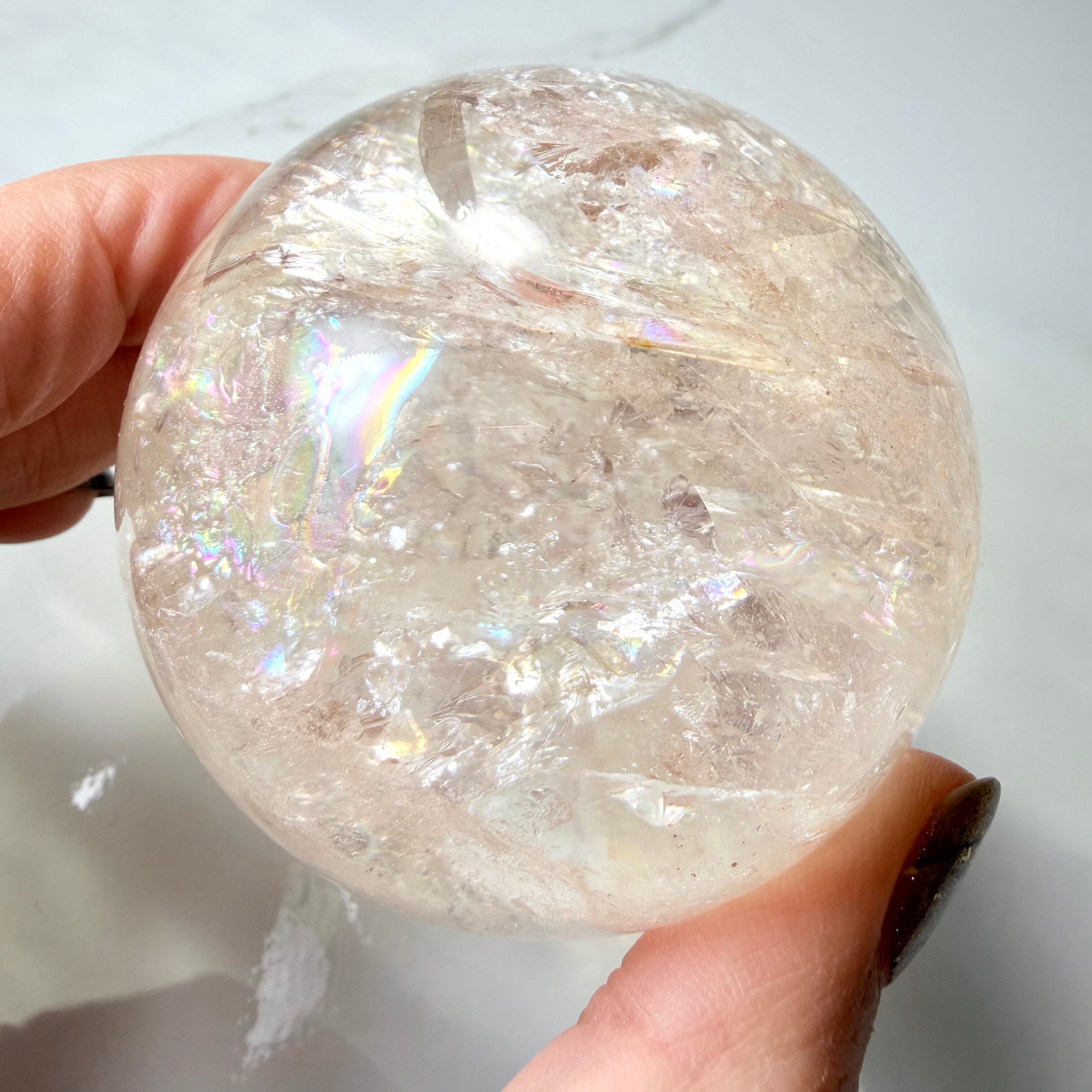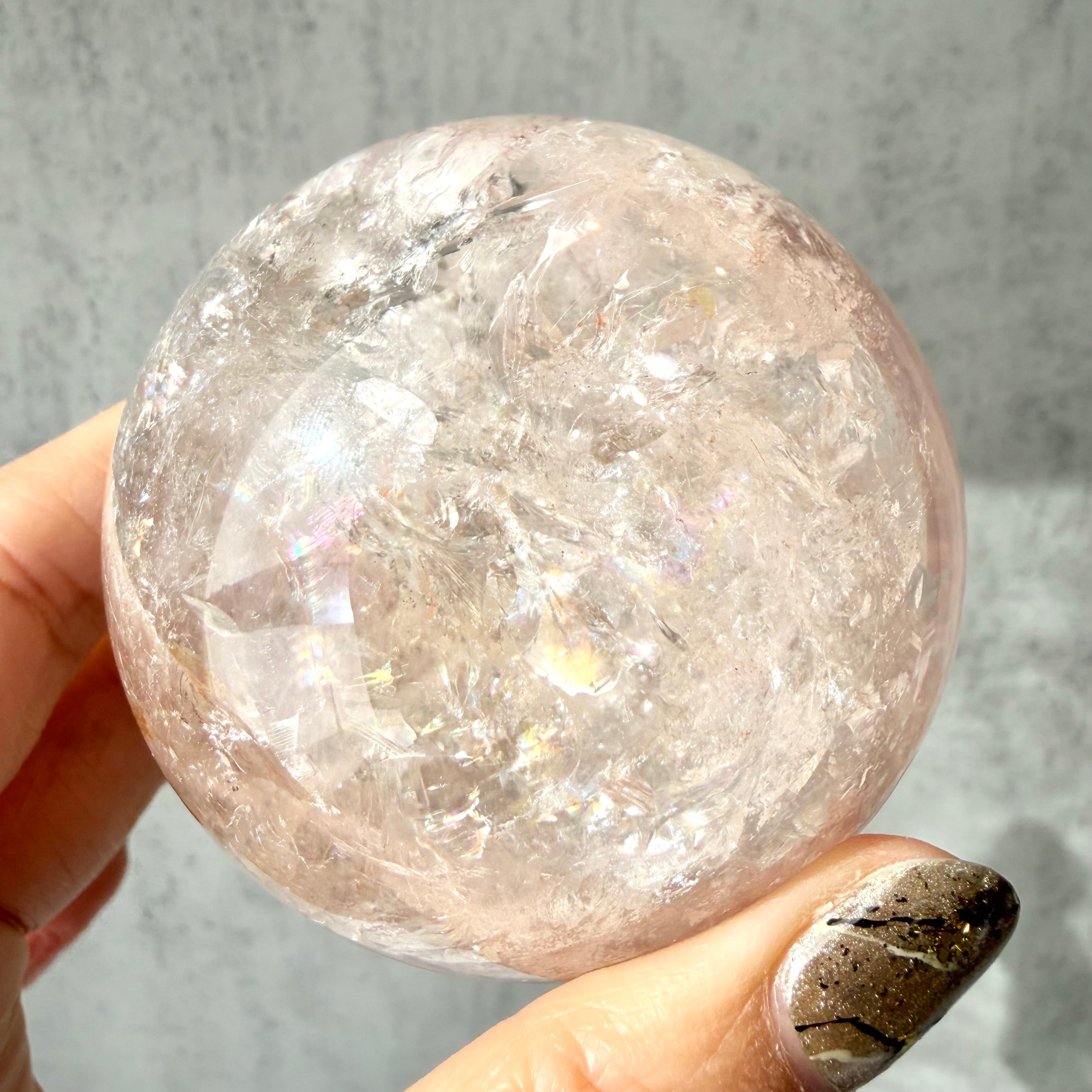 透き通った氷のような質感は、うっとりするほどの美しさです。水晶がゆっくりと成長する中でできた無数のクラックがプリズムとなって、鮮やかなキラキラの虹を映し出す、幻想的なスフィアです。