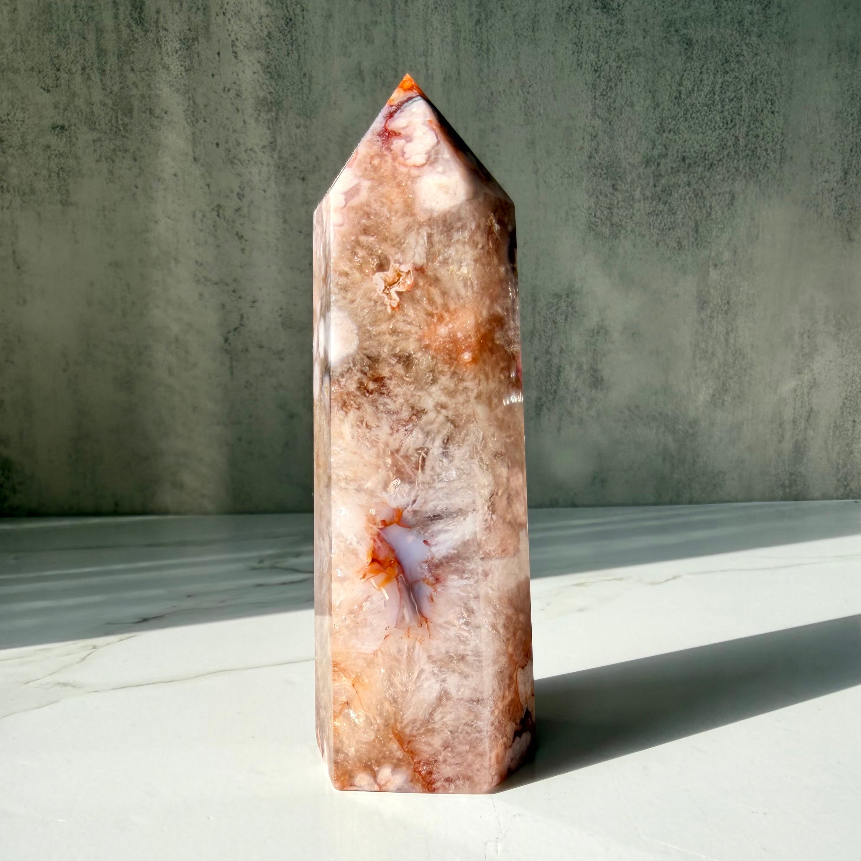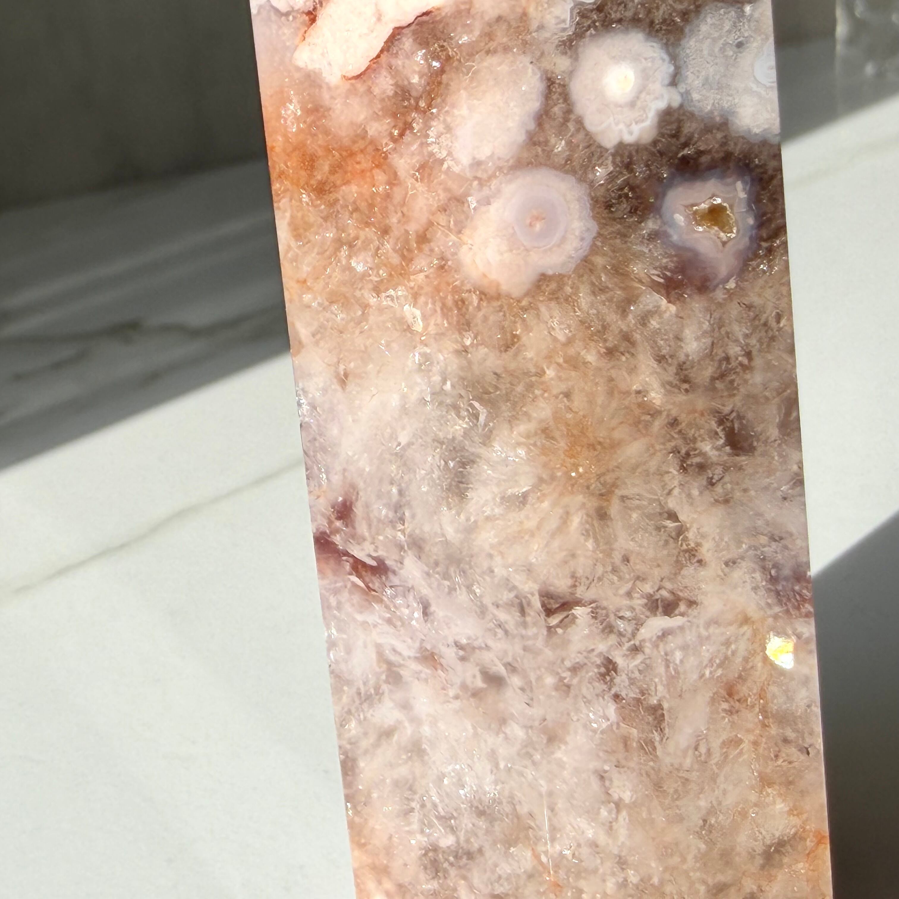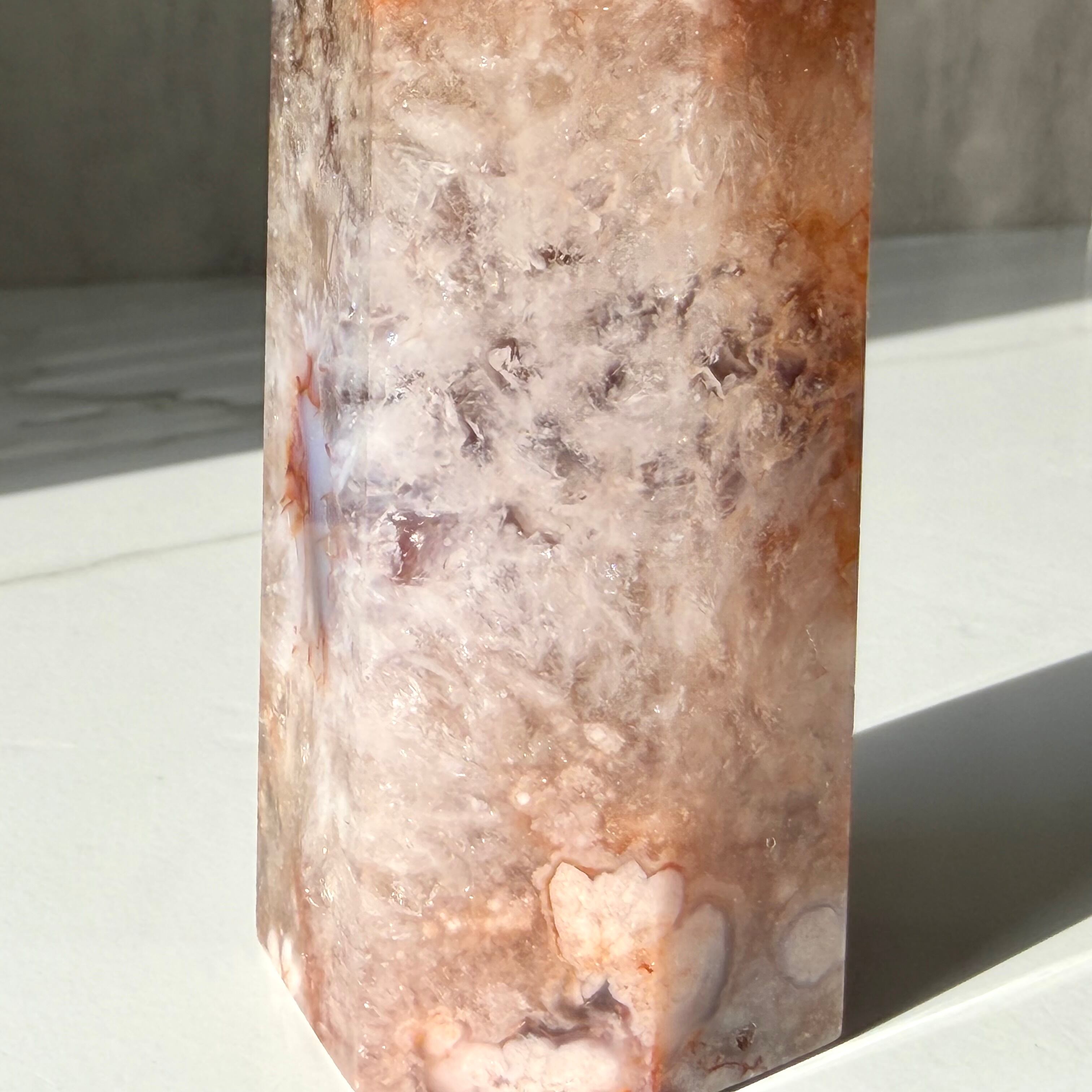 淡いピンクやベージュの地色の中に、白いお花のような模様がくっきりと浮かび上がるフラワーアゲートのタワーです。